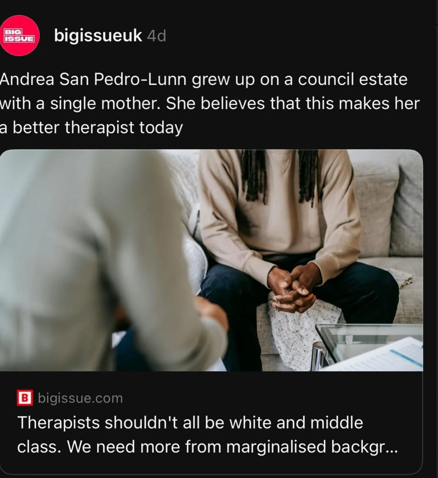 I’ve recently written a very personal (and quite exposing!) piece about my journey training as a therapist, and it’s been published in The Big Issue. It touches on some of the barriers people from working-class and marginalised backgrounds (like me) face in this profession, and why that really matters for the future of therapy.